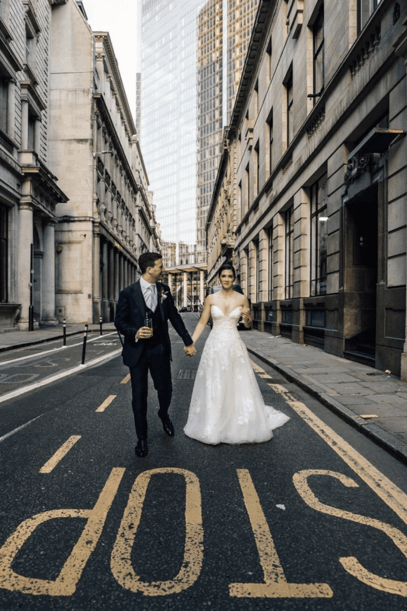I love the idea that a bride and groom are being told to stop! Hopefully it isn't foreshadowing, and a great spot from Ben. The large painted letters and the lines throughout the architecture do an amazing job making this image feel alive and vibrant.