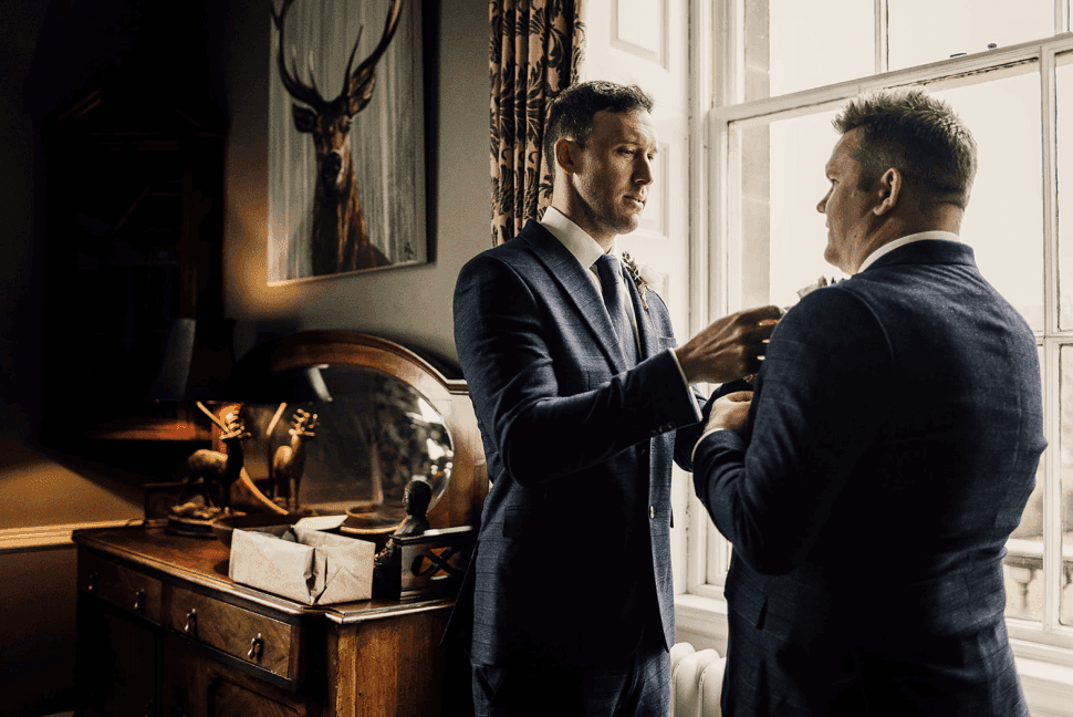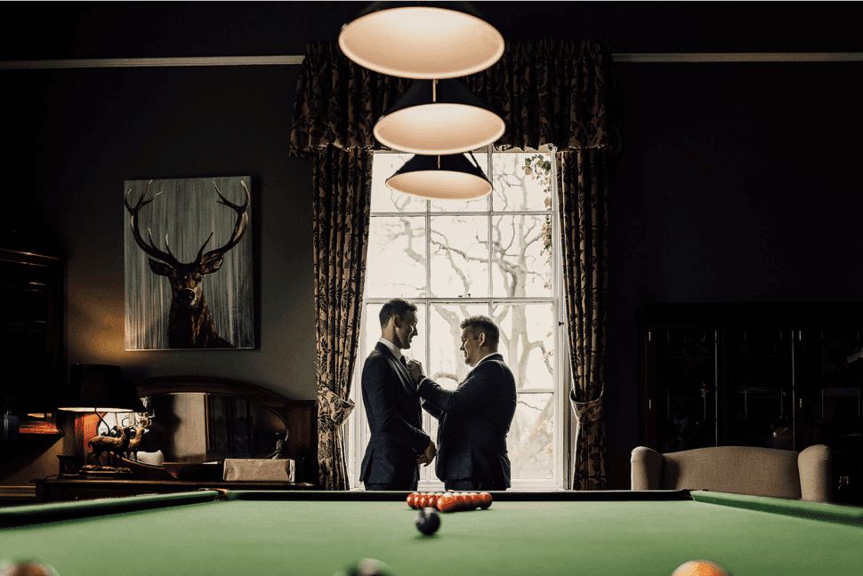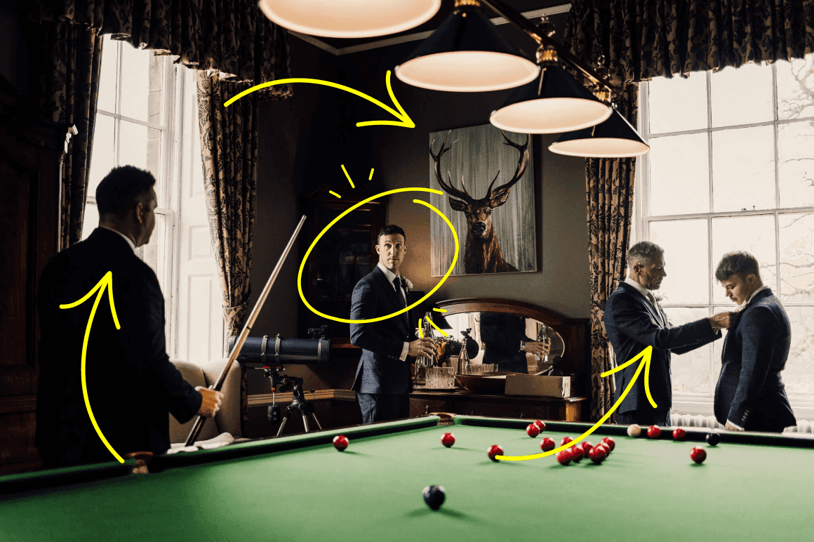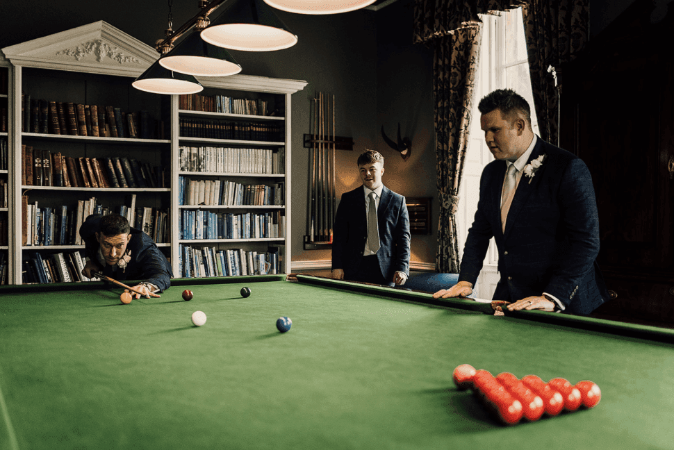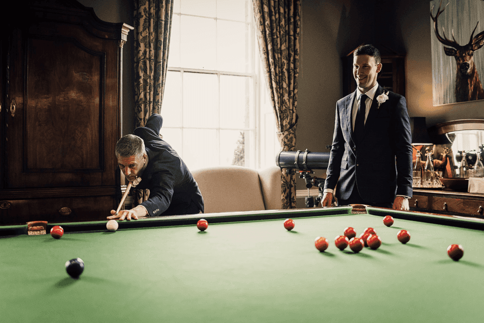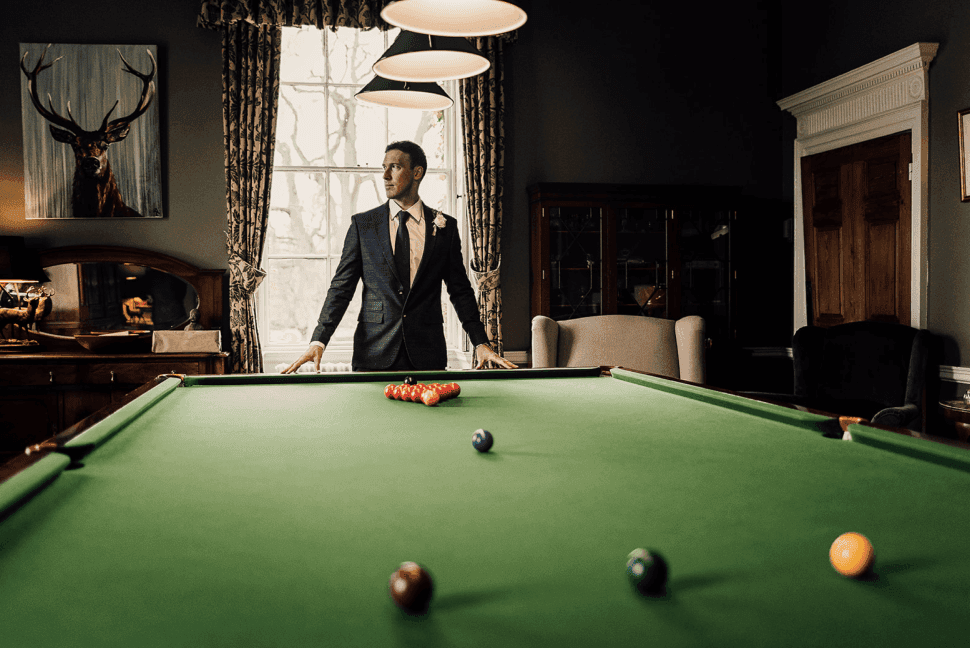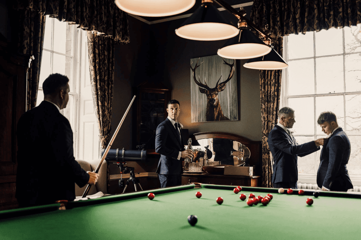 The groom had seen this snooker room earlier in the day and knew he wanted to get ready in it. Matt could already see some of the key visual elements coming together; the snooker table, stag artwork, ceiling lights and the window.